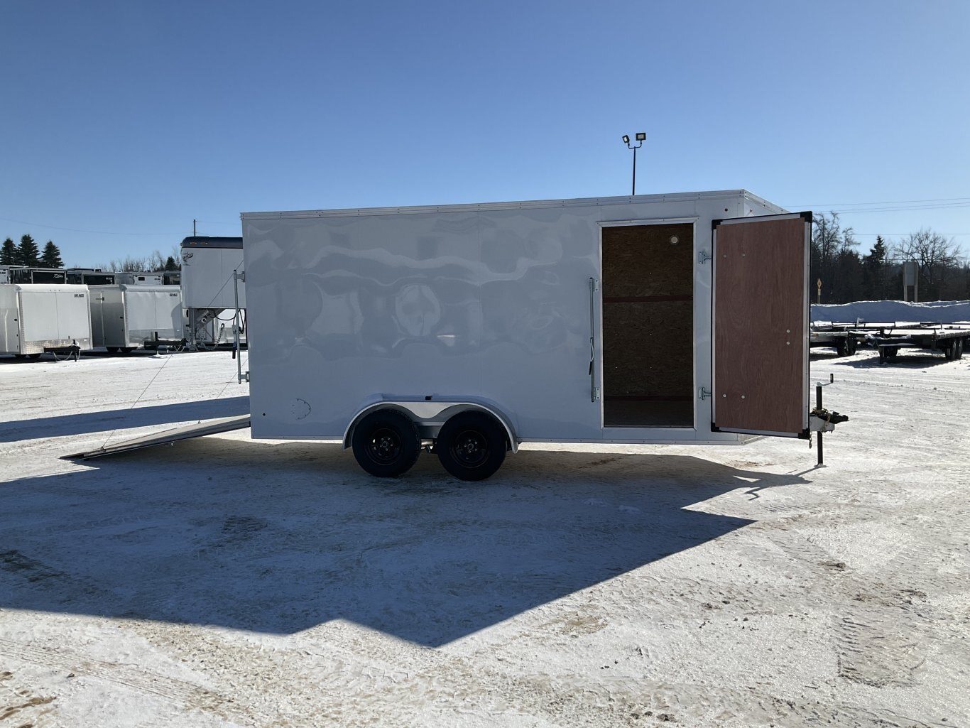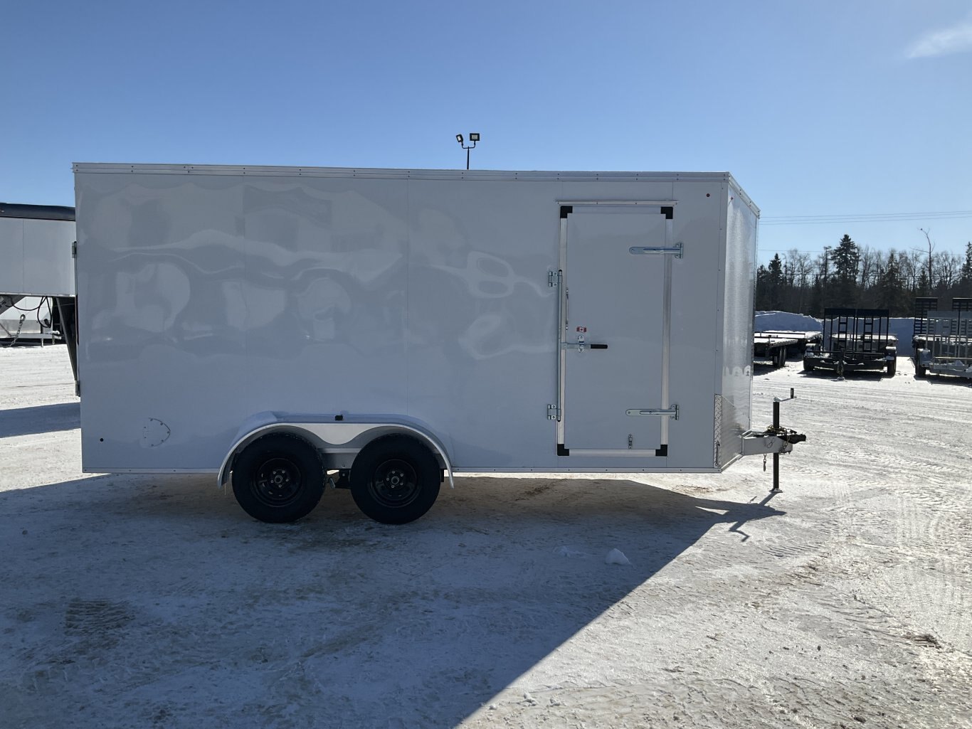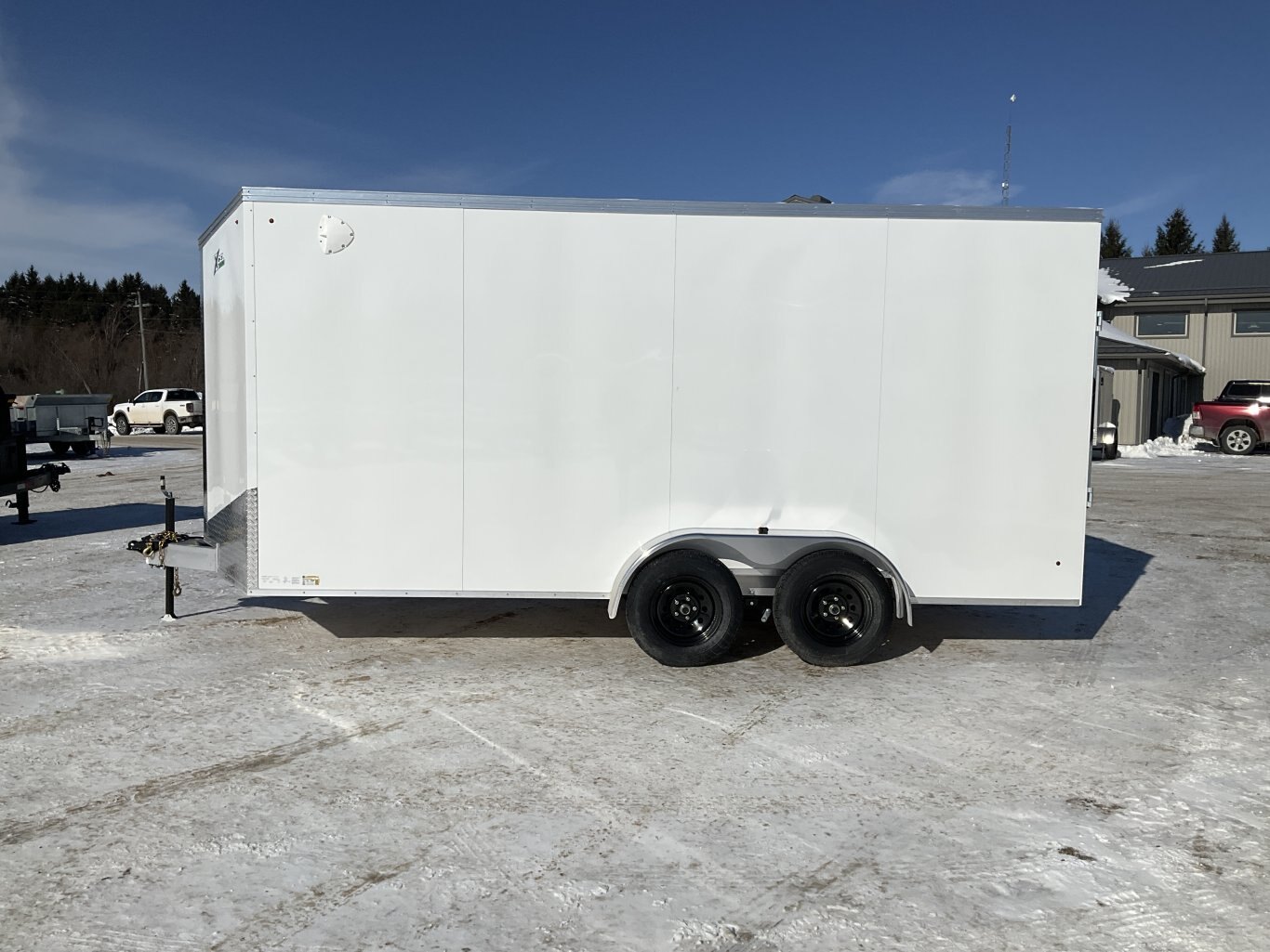 7000LB GVWR, 2 3500LB Spring Drop Axle with EZ Lube Hubs, Electric Brakes, 15 Inch Radial Tires, Electric Brakes, 2' Sloped V-Nose, 7' Tall, .030 White Screwless Exterior, 32" Side Man Door, Rear Ramp Door with Cable Assist, 3/8" Wood Lined Walls, 3/4" Rainblock Wood Floor, Seamless Aluminum Roof, 16" On Centre Walls/Floor/Roof, 2 Wall Vents, 12V Dome Light and Switch, 6 D-Ring Tie Downs, ATP Stone Guard, 2-5/16" Ball Coupler, A-Frame Tongue Jack with Sand Pad, Sealed LED Lighting