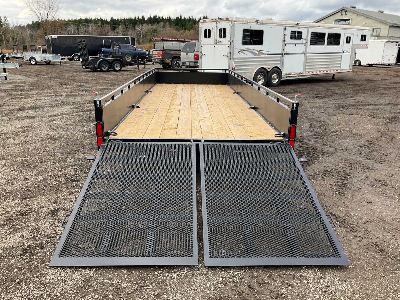 10,800LB GVWR, (2) 5200LB Axles with Easy Lube Spindles, Slipper Spring Suspension, Electric Brakes on Both Axles, 16 Inch Radial Tires, 12,000LB Drop Leg Jack, 20 Inch Deck Height, 14 Inch Solid Steel Sides + 3 Inch Tie Rail, 5' HD Spring Assisted Split Mesh Ramps, Pressure Treated Wood Floor, 53 Inch Tongue Length, Stake Pockets, (6) Welded In D-Rings, Spare Tire Mount, 7 Way RV Plug, Heavy Duty Treadplate Fender Upgrade, Powder Coat Painted, Scorpion Stone Guard On Front, Sealed Rubber Mount LED Lighting, Fully Sealed Wire Harness, Powder Coat Painted with Scorpion Stone Guard on the Front