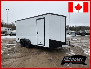 7000LB GVWR, 2 3500LB Torsion Axles, Electric Brakes on Both Axles, 15" Radial Tires, Aluminum Rims, Side Man Door in V-Nose, 6'6" Tall, Black Screwless Exterior, Front and Rear Ramp Door with Tapered Approach, Stainless Lockable Centre Latches, Intergrated Beaver Tail, White Lauan Walls and Ceiling, Black Aluminum Cove Pans & Spring Covers, Marine Grade Floor, Ramps and Kick Panel, 2 Rows of Quickslide Track in Floor, 8 8840 Tie Rings, Grip Glides and Traction Mat on Front Ramp, Roof Vent, 2 Salem Wall Vents, 3 12V Dome Lights with 2 Switches, 48" Black Helmet Cabinet, LED Back Up Lights with Switch for Loading, LED Exterior Lighting