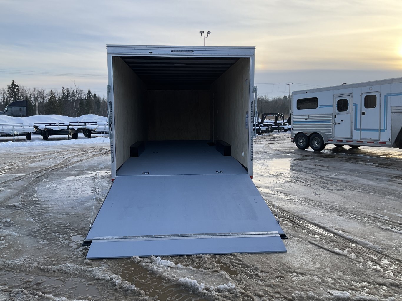 9990LB GVWR, 2 6000 Dexter Torflex Wide Track Axles and EZ Lube Hubs with 5 Year Warranty, Electric Brakes on Both Axles, 15 Inch Tires, Aluminum Diamond Plate Stone Guard, Aluminum Fenders, Aluminum Diamond Plate Corners, 86" Tall, 48 Inch Side Man Door with Inside Step, Inside Beavertail, Rear Ramp Door with Spring Assist,16 Inch On Centre Floor Cross Members, (6) Floor Tie Downs, (2) 12V LED Dome Lights with Switch, .032 Inch Thick One Piece Seamless Aluminum Roof with Lifetime Warranty, 3/4 Inch Exterior Grade Plywood Floor Painted on Both Sides with Lifetime Warranty, Premium LED Exterior Lighting with Lifetime Warranty, 3/8 Inch Plywood Walls, .030 Inch Screwless Aluminum Side Skins, (2) Wall Vents, 8000LB Drop Leg Tongue Jack, Meets or Exceeds NATM Requirements