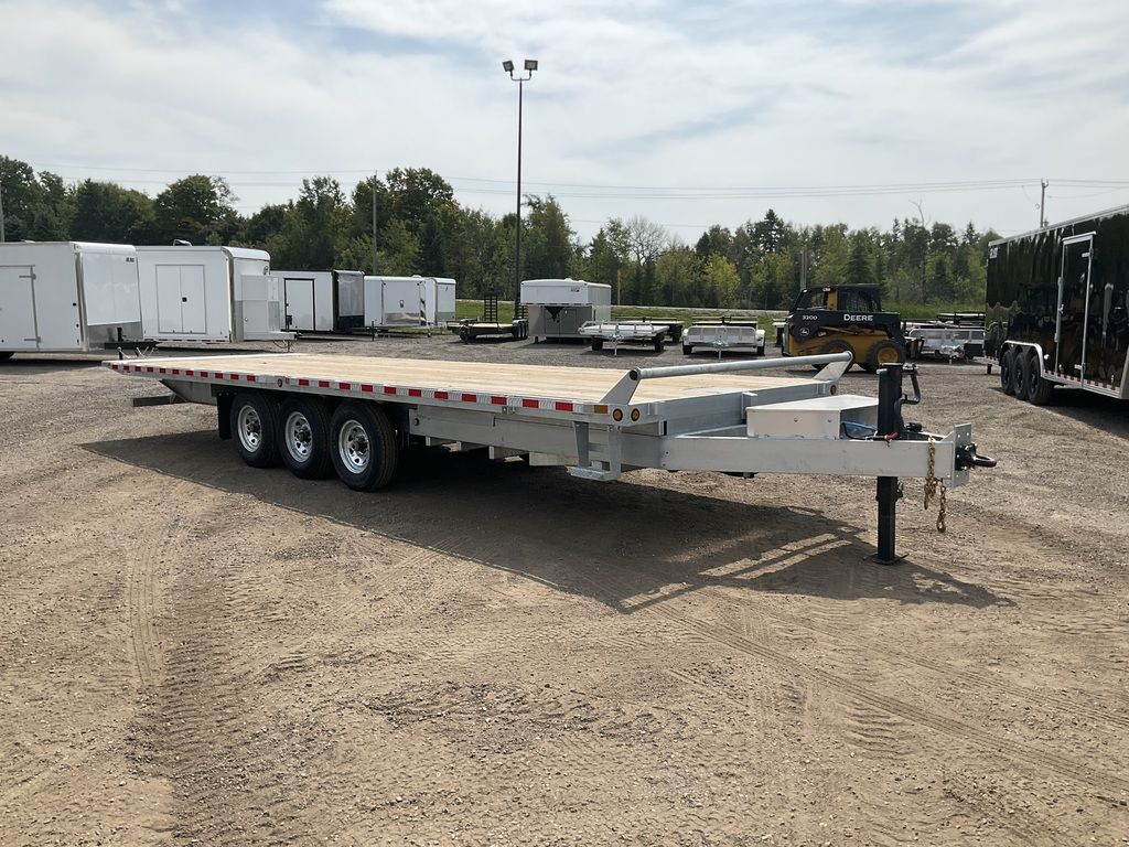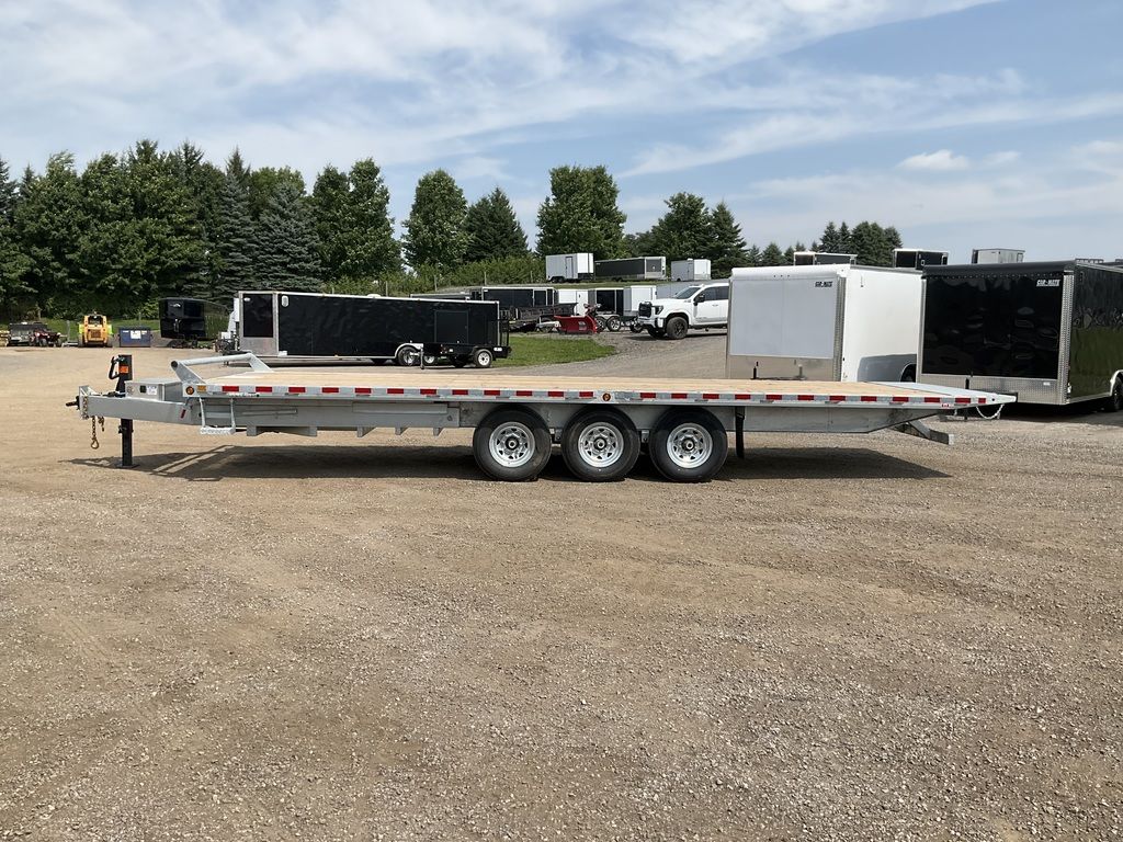 22,680LB GVWR, 3 7000LB Axles with Easy Lube Spindles and Slipper Spring Suspension, 16 Inch Radial Tires, Electric Brakes on All Axles, 12,000LB Drop Leg Jack, Electric Over Hydraulic Full Tilt, Power Up/Power Down Tilt, 5 Inch Hydraulic Cylinder, Interstate Extreme Cycle Battery and Plug In Charger, Lockable Aluminum Toolbox, 62 Inch Tongue Length, 7 Inch Channel Tongue, 7 Inch Channel Lower Main Frame, 10 Inch I Beam Inner Main Frame, Upper Deck 5 Inch Channel Outer Frame, 3 Inch Crossmembers Spaced 16 Inch On Centre, 24 Inch Checkerplate Knife Edge, 36 Inch Deck Height, Pressure Treated Wood Floor, Stake Pockets and Rub Rails, Spare Tire Mount, Rubber Mount Sealed LED Lighting, Full Sealed Wire Harness, Galvanized