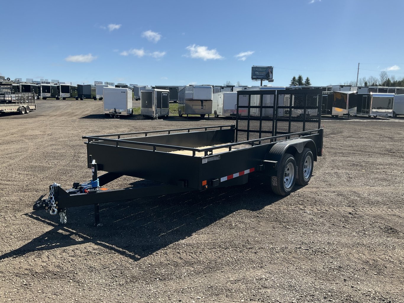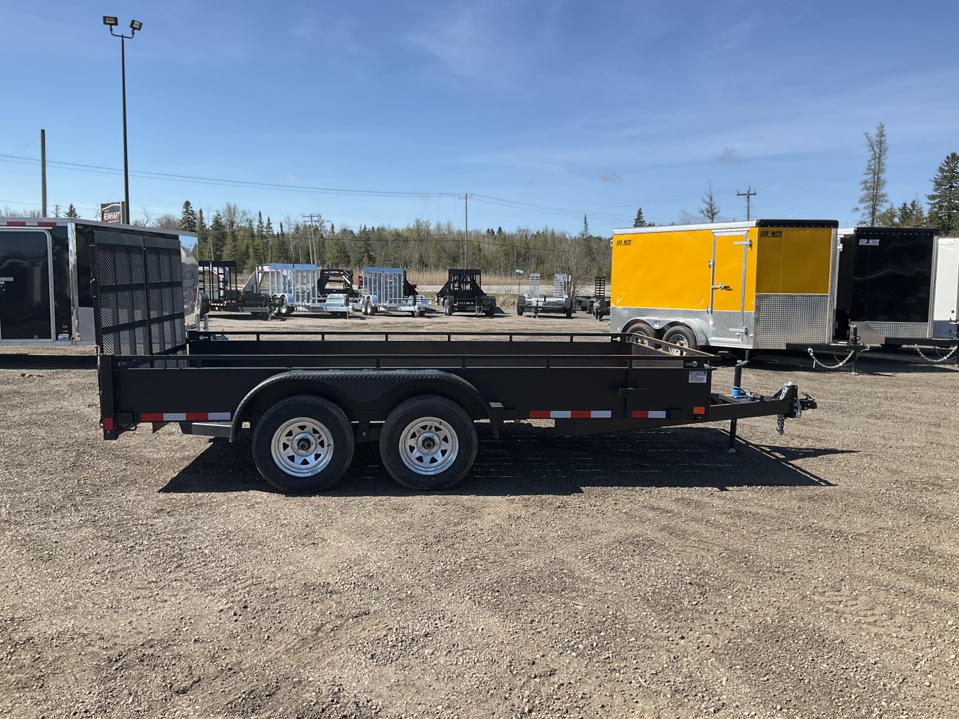 7560LB GVWR, 2 3500LB Axles with Easy Lube Spindles and Slipper Spring Suspension, Electric Brakes on Both Axles, 15 Inch Radial Tires, Treated Plank Deck, 19 Inch Deck Height, 14 Inch Solid Steel Sides + 3 Inch Tie Rail, 4' Split Mesh Ramps, Stake Pockets, 6 Welded in D Rings, Spare Tie Mount, Rubber Mount Sealed Lighting, Full Sealed Wire Harness, Tongue Jack, Powder Coat Painted with Scorpion Stone Guard on the Front |