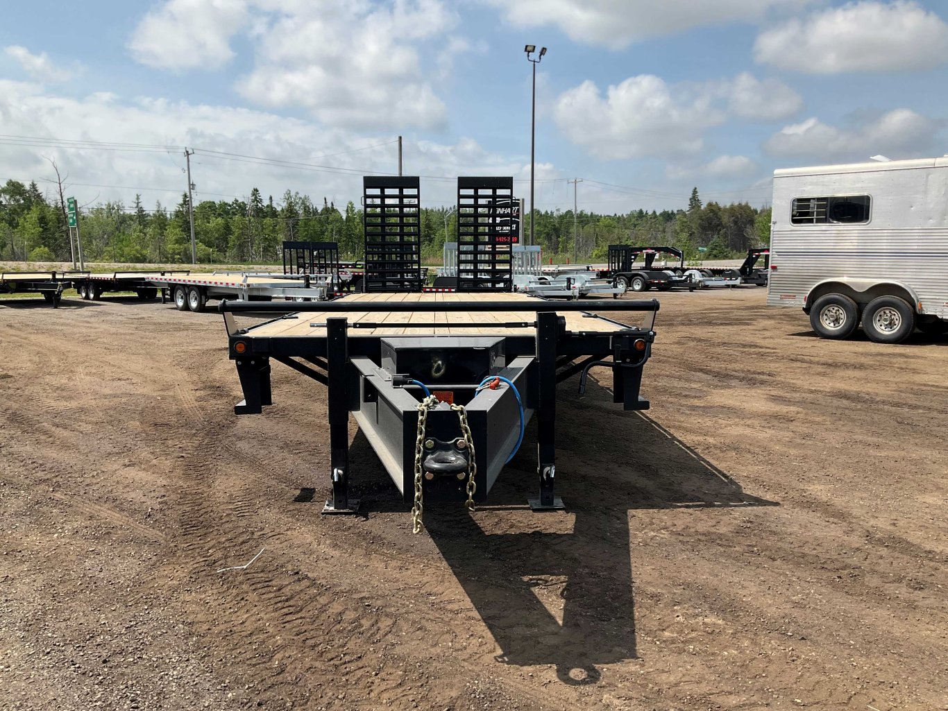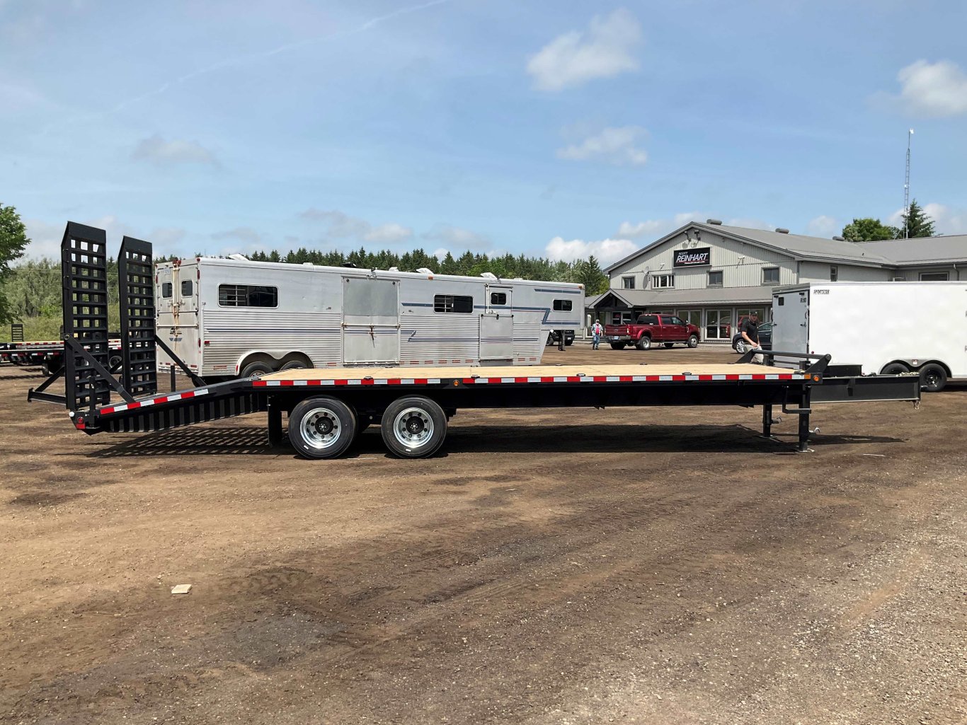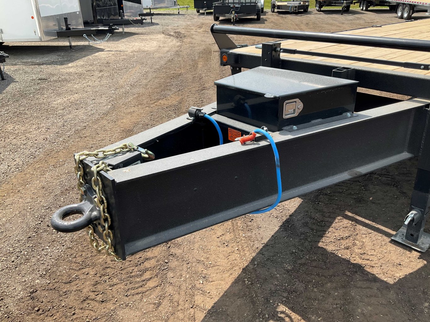 30,000LB GVWR, 15,000LB Tandem Axles, Oil Bath Hubs, Electric Brakes, 17.5" Radial Tires, Pair of Drop Leg Jacks6' Angle Iron Beavertail, 7'x36" Ramps with Wide Support Legs, Extended Tongue, Crossmembers Every 16", 36" Deck Height, Pressure Treated Wood Floor, Stake Pockets and Rub Rails, Side Steps, Winch Track, Spare Tire Mount, 12 HD D-Ring Tie Downs, Lockable Toolbox, LED Lights, Sealed Harness, Black Powder Coat Painted with Scorpion Stone Guard |
