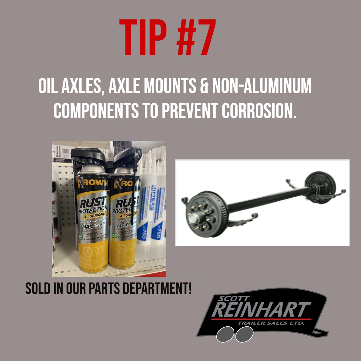 With aluminum trailers, it is important to oil axles, alxe mounts and other non-aluminum components, particulary where dissimilar metals meet to prevent corrosion. We sell an oil in our parts department that works well. Feel free to give our parts and service department a call for best practices. |