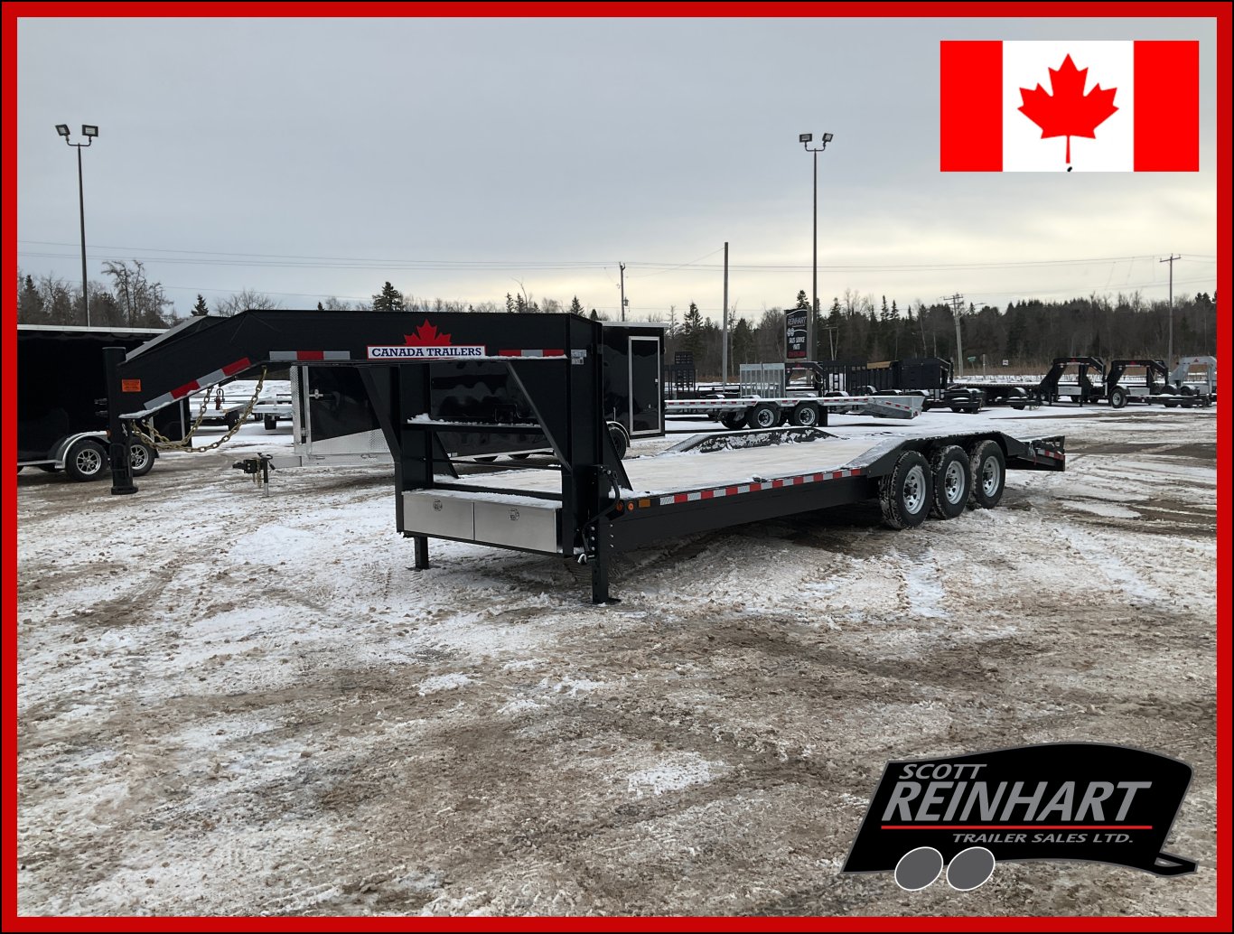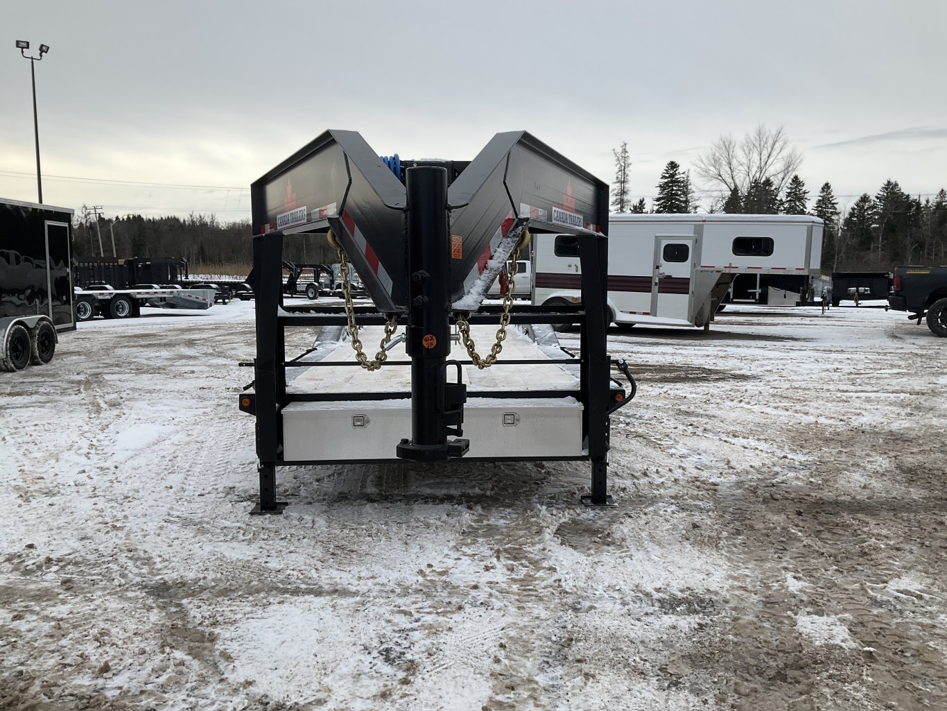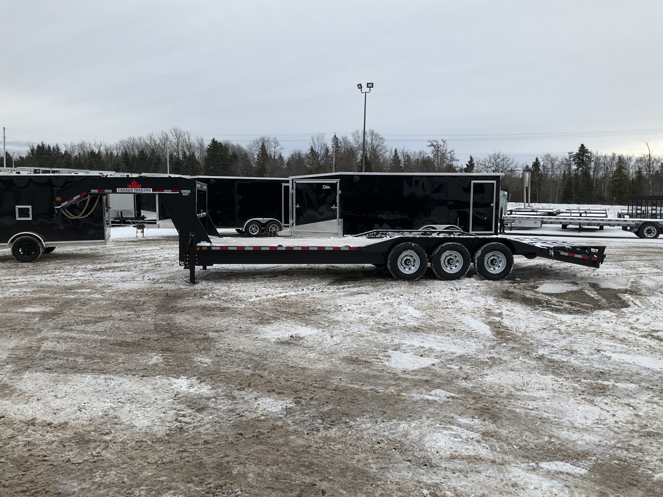 22,680LB GVWR, 3 7000LB Axles with Easy Lube Spindles and Slipper Spring Suspension, 16 Electric Brakes on All Axles, 16" Radial Tires, HD Drive Over Fenders, 102x36 Treated Plank Deck, Stake Pockets and Rub Rail, 4' Dove Tail with Mini Mega Ramps, Raised Winch Plate Between Risers, Adjustable 2-5/16 Coupler, Double 10,000LB Landing Gear, Sealed Wiring Harness, Sealed LED Rubber Mount Lighting, Black Powder Coat Painted with Scorpion Stone Guard |