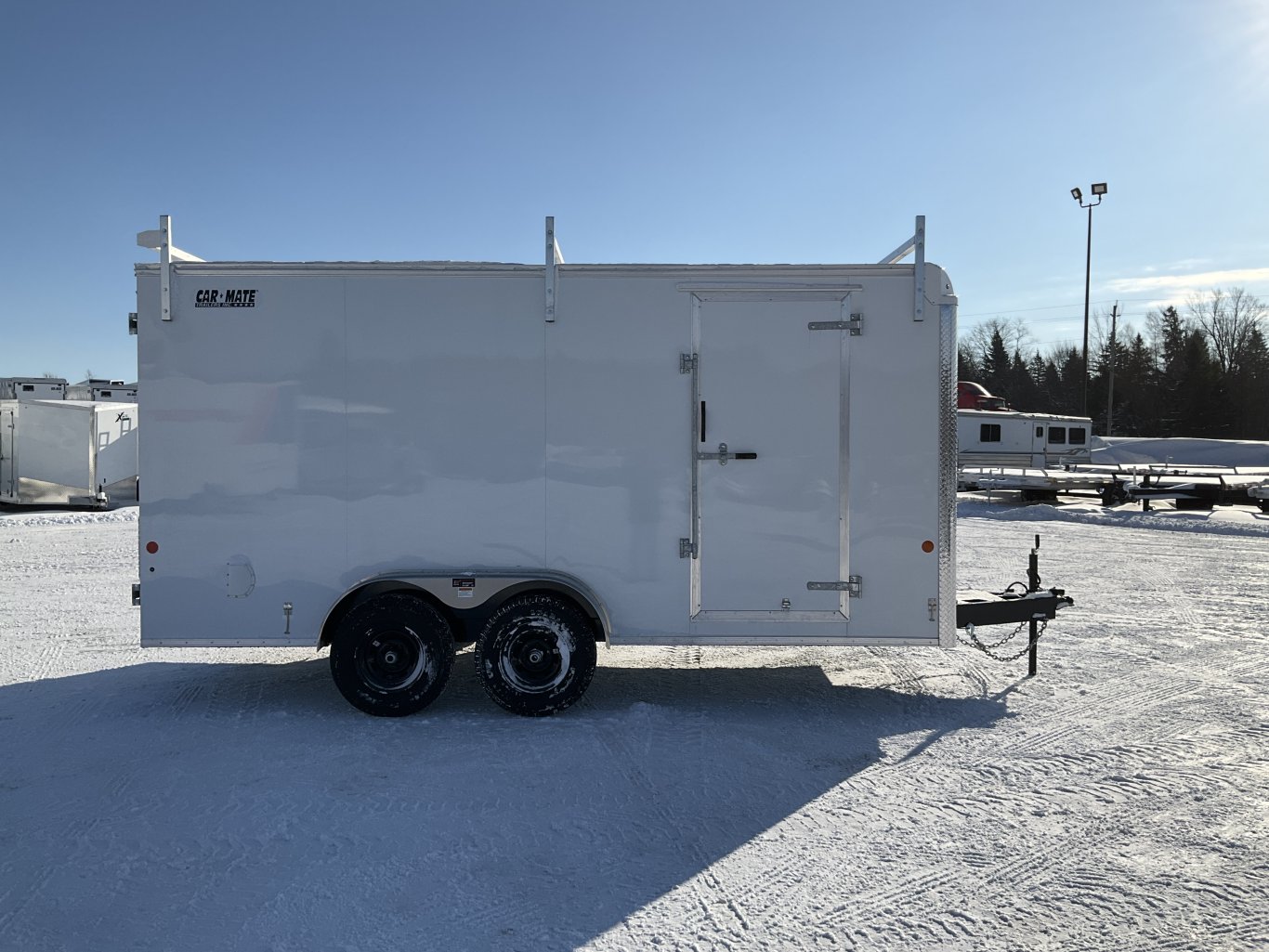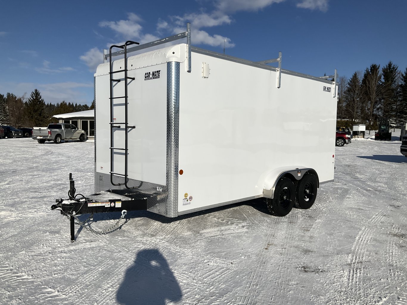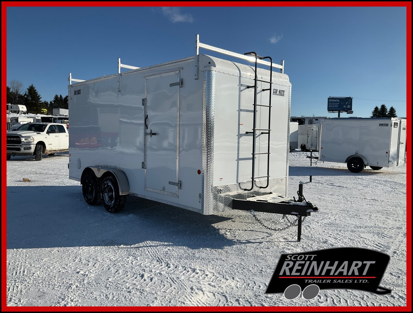 9990LB GVWR, 2 6000LB Torflex Axles, Electric Brakes on Both Axles, 15" Radial Tires, .030" White Screwless Exterior, Side Man Door, Double Rear Doors, 1/4" Plywood Walls, 3/4" Painted Plywood Floor, 16" On Centre Floor, 24" ATP Stone Guard, Triple A Frame, A-Frame Tongue Jack with Sand Pad, LED Exterior Lighting, Contractor Package Including: 82" Tall to Square, Reinforced Flat Roof, 2 Wall Vents, 2 12V LED Dome Lights with Switch, 110V 15 AMP Inlet Receptacle, 11-V Duplex Wall Receptacle, Ladder On Front with APT Drawbars, 3 Aluminum Ladder Racks |