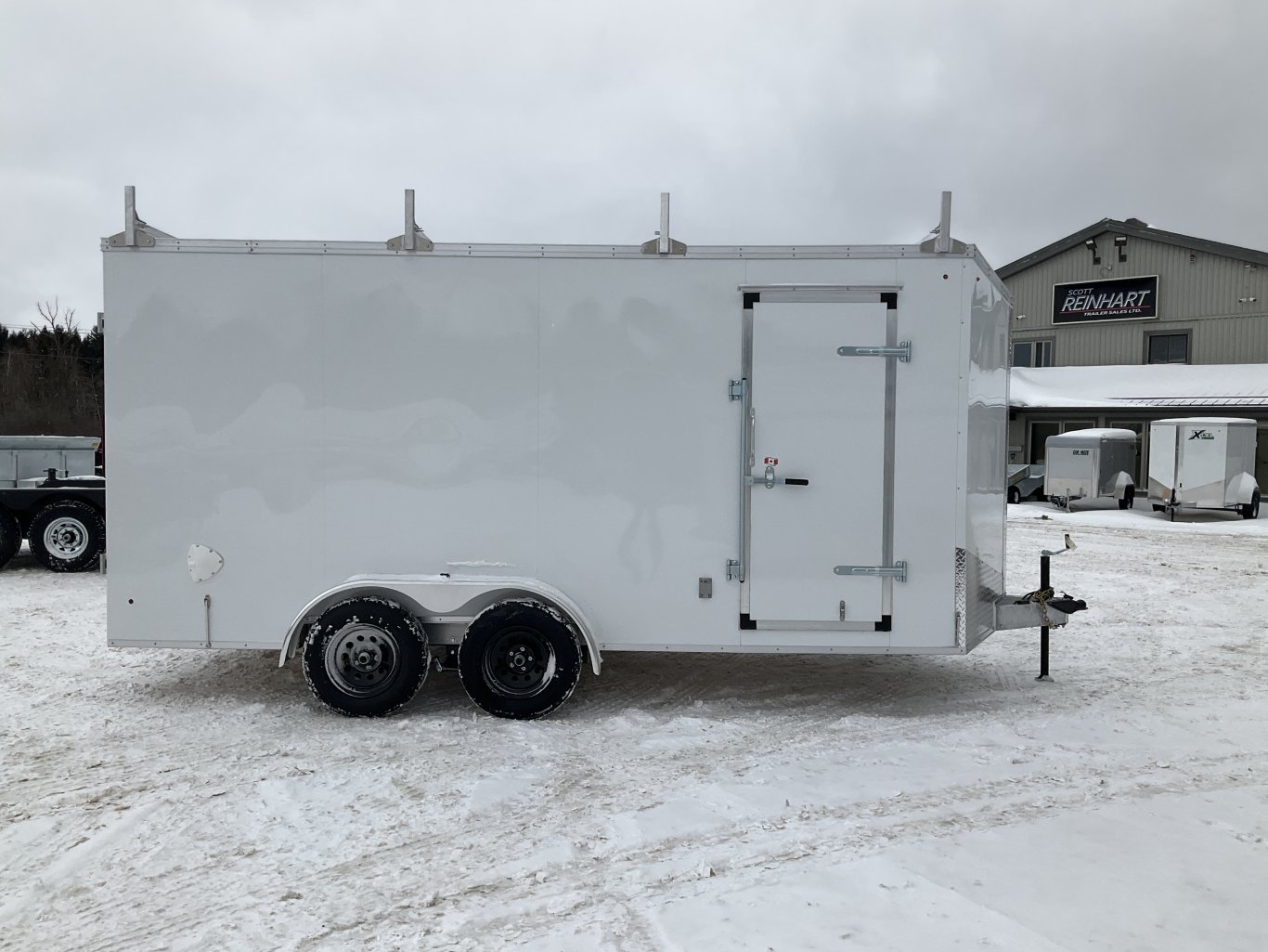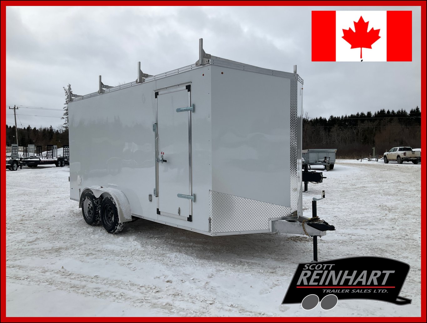 7000LB GVWR, 2 3500LB Spring Drop Axle with EZ Lube Hubs, Electric Brakes, 15 Inch Radial Tires, Electric Brakes on Both Axles, 2' Sloped V-Nose, 7' Tall, .030 White Screwless Exterior, 32" Side Man Door, Double Rear Doors, 3/8" Wood Lined Walls, 3/4" Marine Rainblock Wood Floor, Seamless Aluminum Roof, 16" On Centre Walls/Floor/Roof, 2 Wall Vents, 12V Dome Light and Switch, 4 Aluminum Ladder Racks, 110V Inlet and Duplex Receptacle, ATP Stone Guard, 2-5/16" Ball Coupler, A-Frame Tongue Jack with Sand Pad, Sealed LED Lighting |