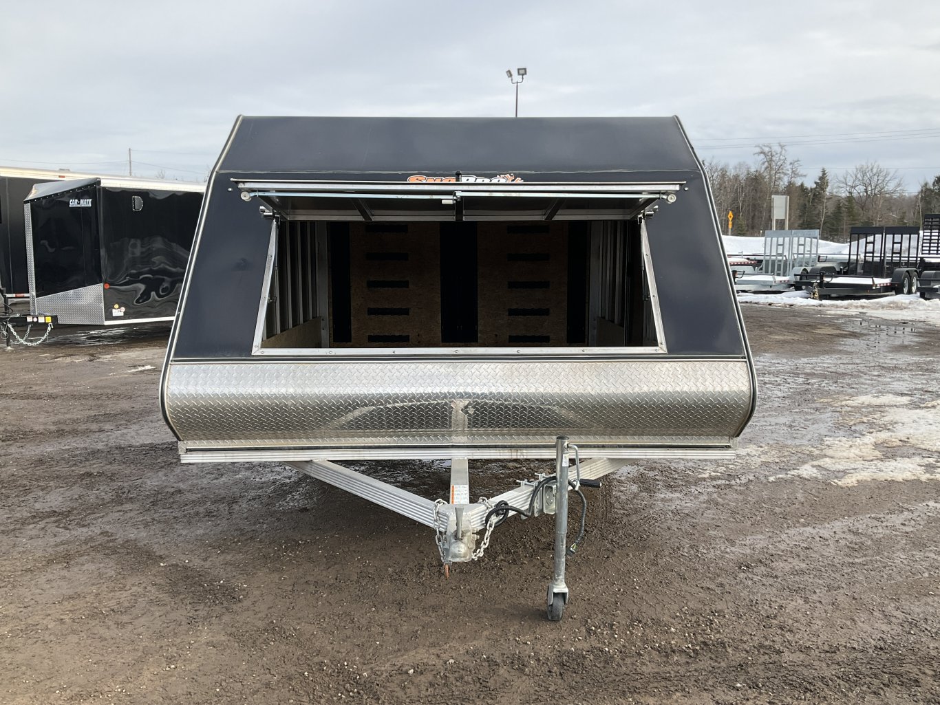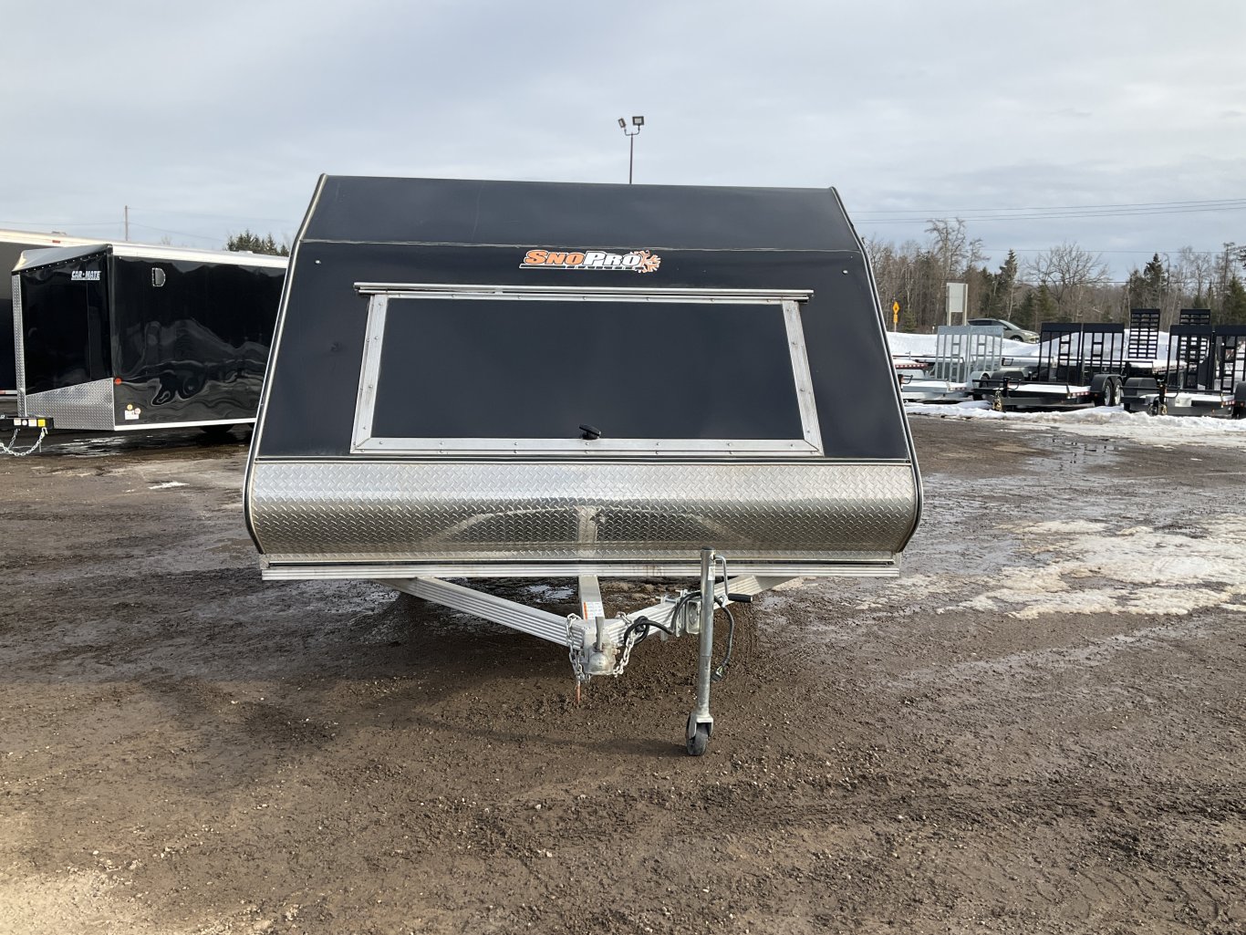 3500LB Torsion Axle, 12 Inch Radial Tires, Silver Mod Steel Wheels, Black Screwless Exterior, 52" Wide Front Access Door, Side Man Door, Rear Ramp Door with Tapered Approach, 5/8" Water Resistant Decking, 12" Kick Panel, Full Length Slide Track in Floor, 2 Adjustable Ski Bars, 2 D-Rings for Slide Track, Paddle Grabbers and Ski Guides, 2 Wall Vents, 12V Dome Light, ATP Gravel Guard, Swivel Wheel Tongue Jack, Spare Tire and Rim, Sealed Wiring and LED Lighting |