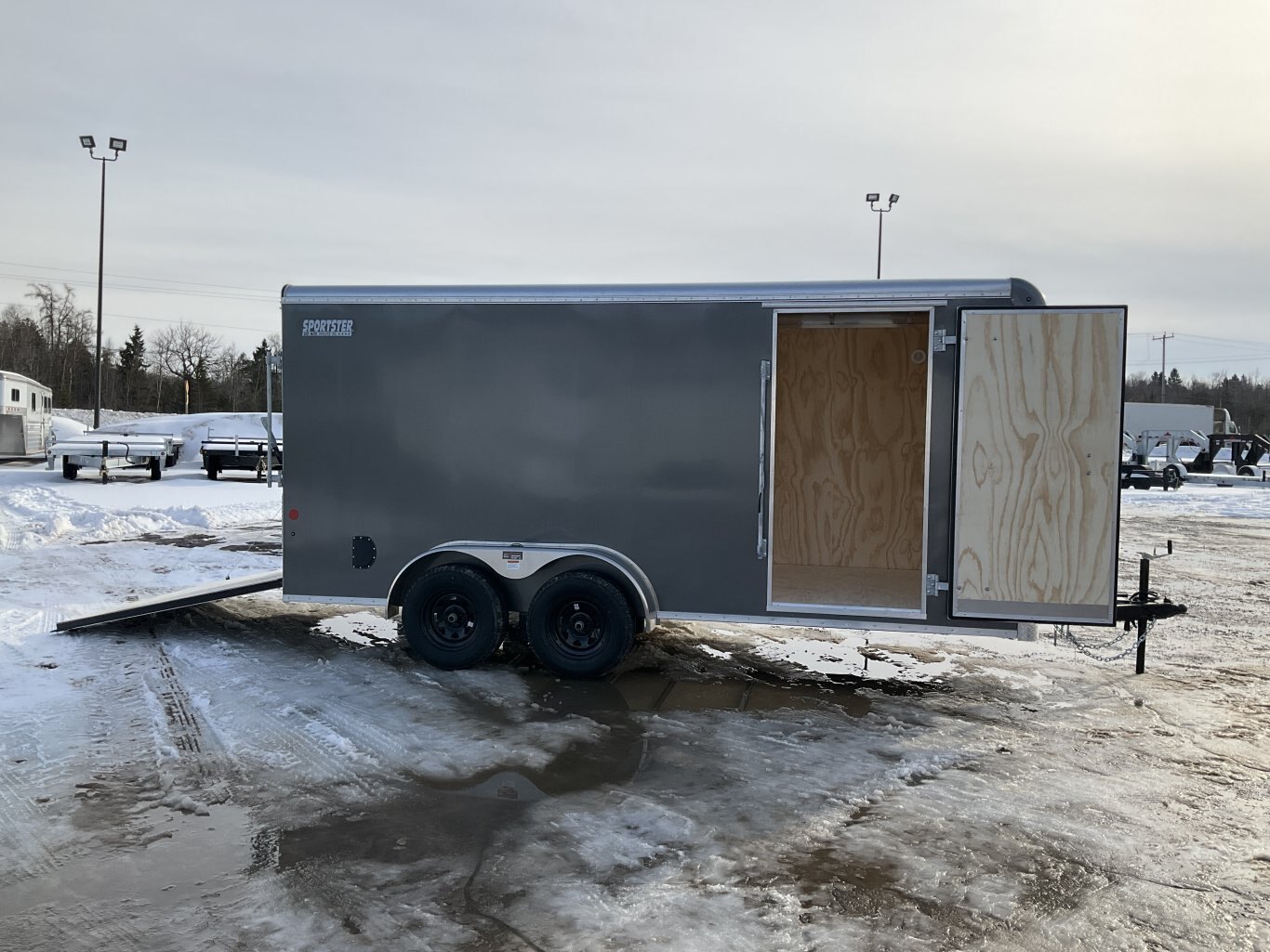 7000LB GVWR, 2 3500LB Dexter Drop Spring Axles, Electric Brakes on Both Axles, 15" Radial Tires, 6'6" Tall, .030 Charcoal Grey Exterior, Side Man Door, Rear Ramp Door with Cable Assist, 3/8 Plywood Walls, 3/4" Plywood Floor, Seamless Aluminum Roof, 2 Wall Vents, 2 12V LED Dome Lights with Switch, 4 HD D-Ring Tie Downs, 16" ATP Stone Guard, A-Frame Tongue Jack with Sand Pad, LED Exterior Lighting